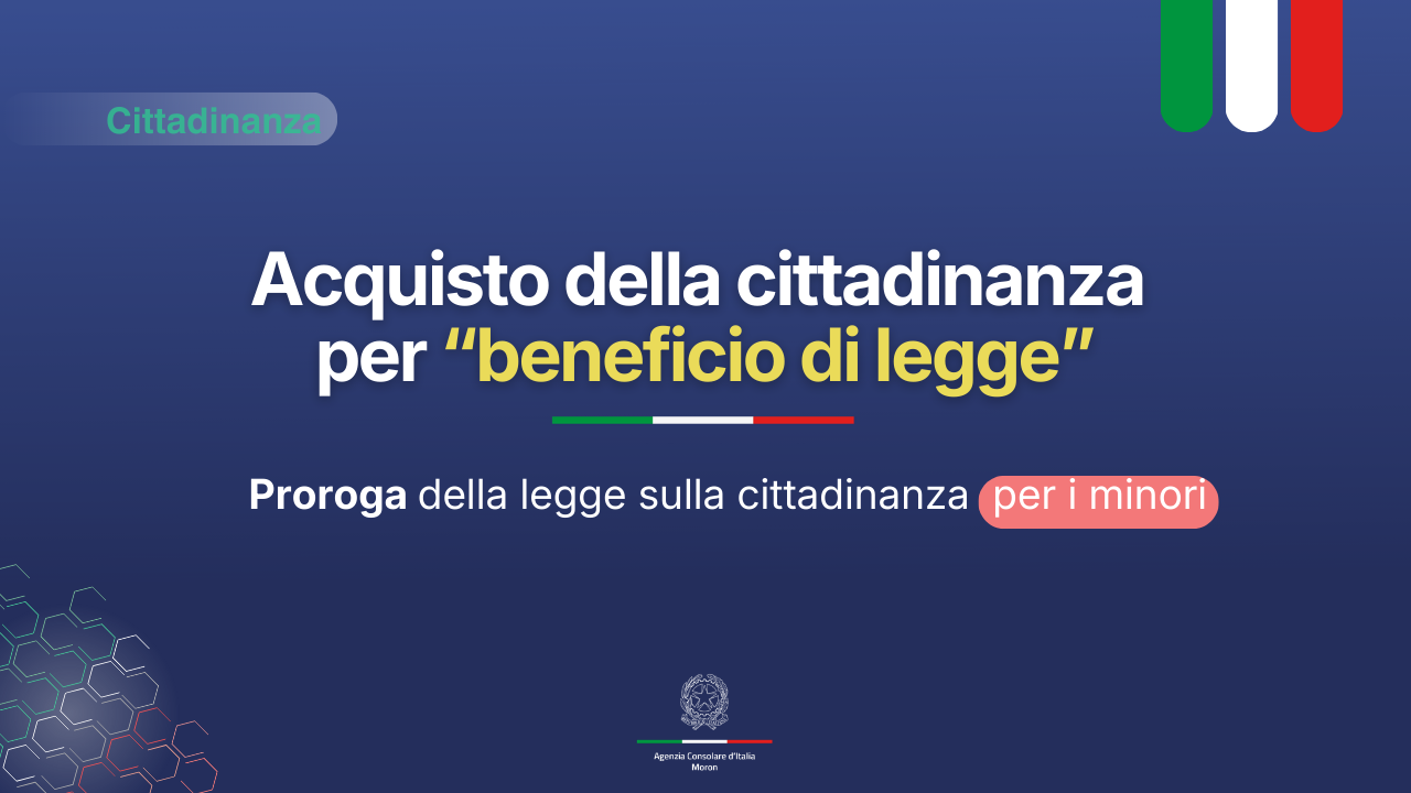 Con riferimento alle istanze di acquisto della cittadinanza per beneficio di legge in favore dei minorenni alla data del 24 maggio 2025, figli di cittadini per nascita che si trovano nelle condizioni previste dalle lettere a), a-bis) e b) dell’articolo 3-bis della legge n. 91/1992, si informa che è stata disposta la proroga del termine previsto dall’articolo 1, comma 1-ter, del Decreto-Legge 28 marzo 2025, n. 36, dal 31 maggio 2026 al 31 maggio 2029.